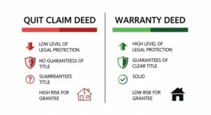 This difference affects legal risk and potential financial exposure. Using a quit-claim deed without proper investigation can result in inheriting unpaid taxes, existing mortgages, or liens. These are common repercussions of a quit-claim deed that parties often overlook in informal transfers.